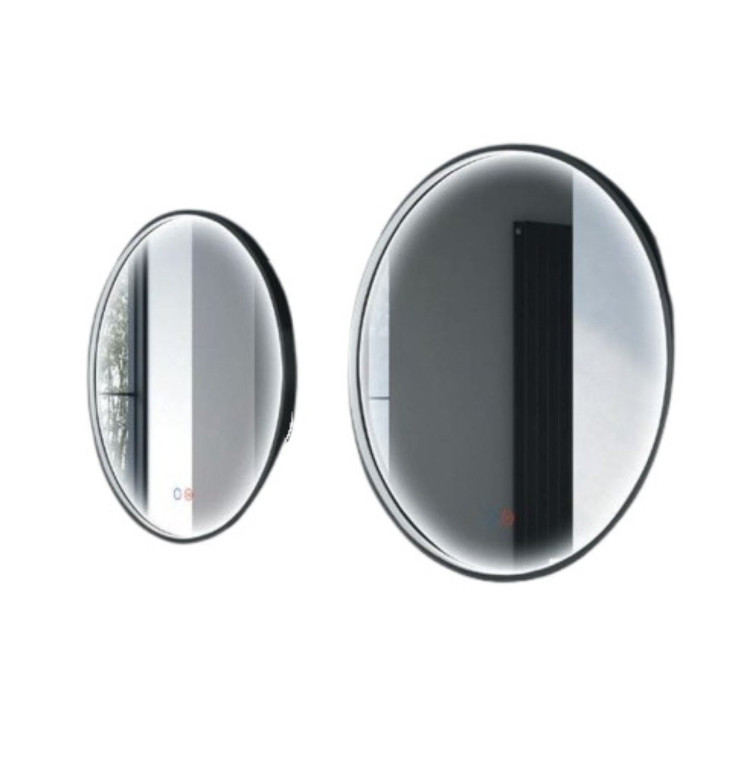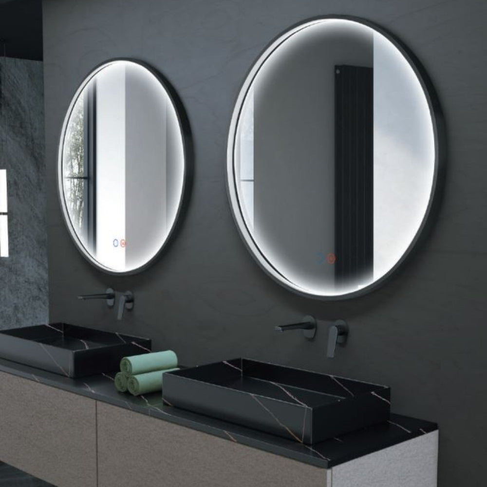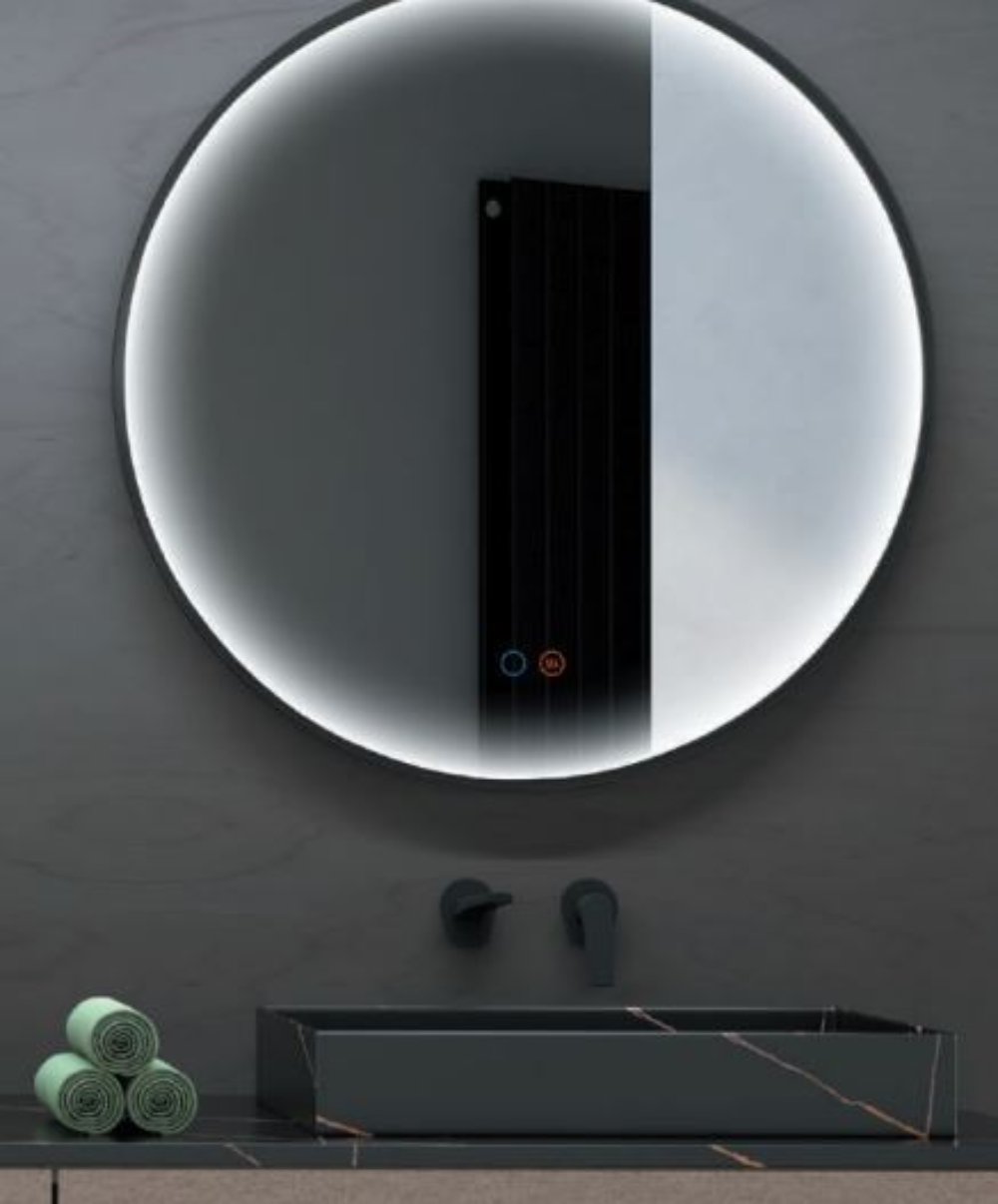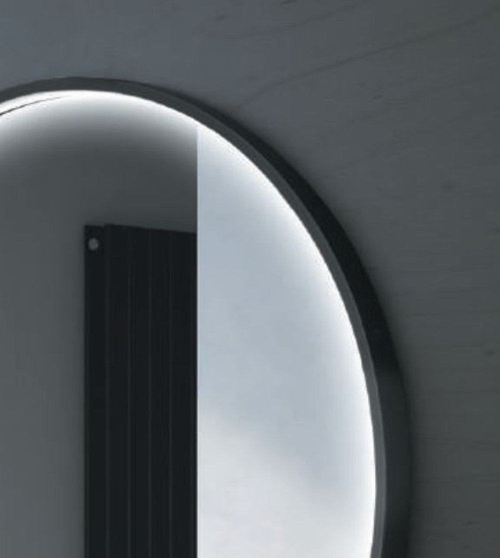 Tres tipos de que combina lo simple de un espejo redondo retro-iluminado con el valor añadido del marco en aluminio color negro mate que aporta calor y diseño al cuarto de baño